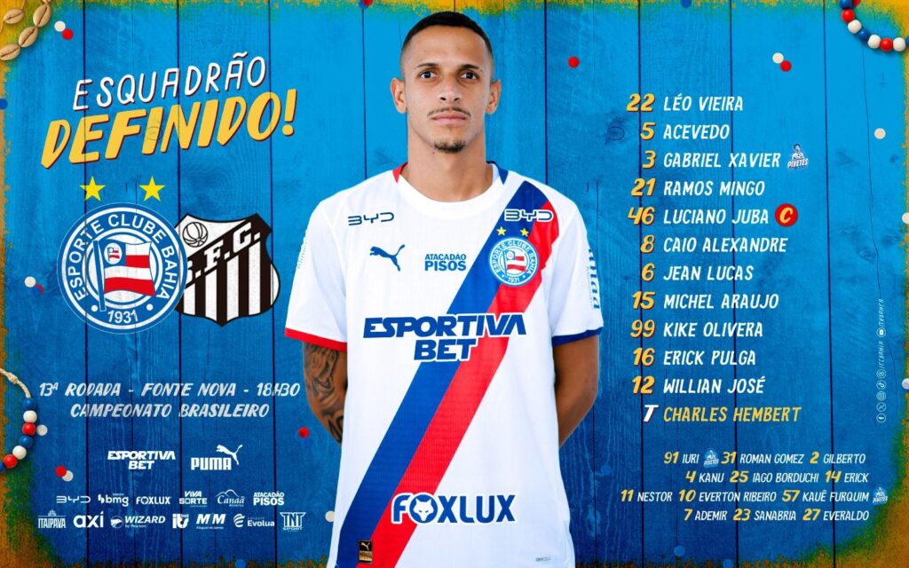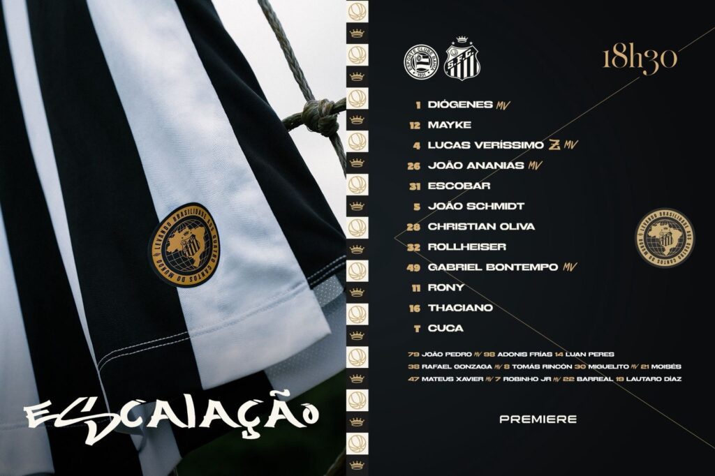 Escalação do Santos FC: O Santos enfrenta o Bahia pelo Campeonato Brasileiro 2026, logo mais às 18h30, na Casa de Apostas Arena Fonte Nova. Veja o time do Peixe.