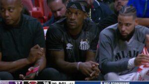 3/11/2022 @ 10:00Astro Jimmy Butler veste camisa do Santos durante partida da NBA